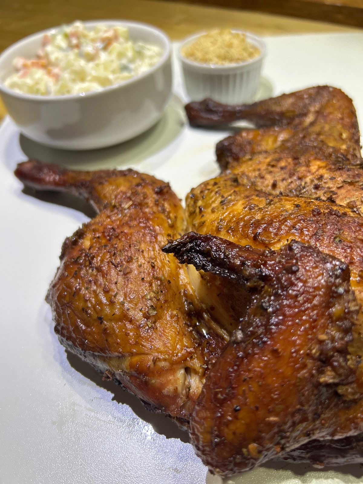 Frango na BrasaSabor intenso, defumado lentamente na brasa para garantir crocância por fora e suculência por dentro. Porção: Frango inteiro, vai ao defumador com aproximadamente 2kg a 2.800g in natura. Serve 4 pessoas. Acompanhamento: 300g maionese + 180g Farofa caseira.R$ 50,00